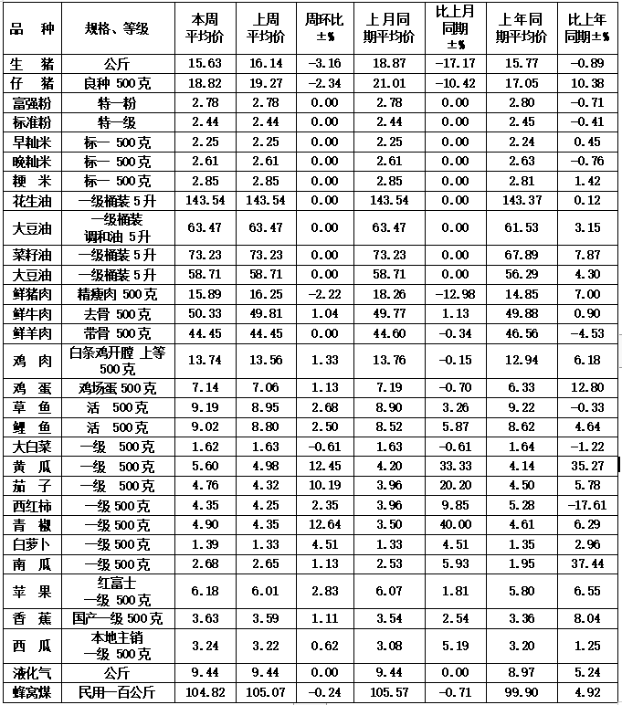 本周是春节前最后一周,全省重要民生商品供应充足、价格总体平稳。其中,生猪、仔猪及鲜猪肉价格继续下跌,跌幅稍有缩窄;牛肉及禽蛋鱼价格略有上涨;蔬菜价格涨幅略有扩大。具体情况如下: