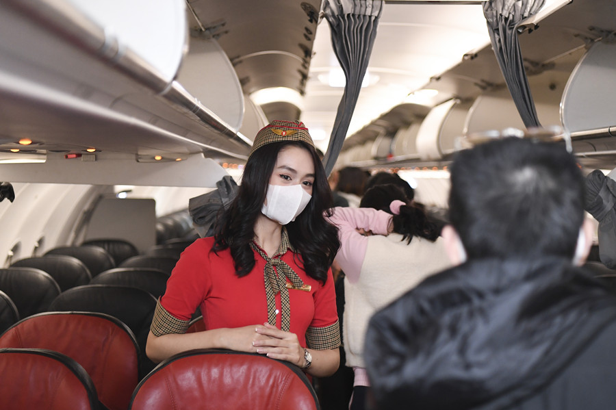 2月8日晚,长沙黄花国际机场,空姐在前往越南芽庄的VJ5357次航班上欢迎游客登机。目前,黄花国际机场已恢复长沙至内罗毕、吉隆坡、曼谷、河内、芽庄、香港等6条国际及地区客运航线,将加快恢复长沙至新加坡、首尔、东京、大阪、芭堤雅、清迈、金边等“四小时航空经济圈”航线网络,出境游重启往日“喧嚣”。湖南日报全媒体记者 辜鹏博 彭可心 摄影报道