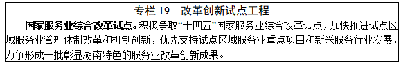 打造长株潭国家现代服务业中心。大力推动长株潭一体化发展,以长株潭三市为中心,统筹岳阳、常德、益阳、娄底、衡阳5市联动,强化科技服务、信息服务、现代金融、文化创意、商务服务等重点产业一体化布局,促进基础设施互联互通,推进医疗、教育、养老等公共服务共建共享,全面提升长株潭都市圈整体实力,着力打造立足中部、辐射西南、连通长江经济带和粤港澳大湾区的国际文化创意中心、国家科技创新中心、交通物流中心、区域现代金融中心等。