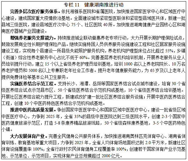 8.康养服务。深入实施“健康湖南行动”,满足城乡居民多样化、差异化、个性化的健康养老服务需求。力争到2025年,基本建成服务全生命周期、结构合理、功能完善的健康服务体系,及覆盖城乡、分布均衡、惠及全民的养老服务体系。发展医疗健康服务。加快推进国家医学中心和国家区域医疗中心建设,统筹推进省级区域医疗中心和优质医疗资源扩容下沉项目建设,完善农村三级卫生服务网络和城市社区卫生机构,推进标准化乡镇卫生院建设和村卫生室改造。引导社会办医差异化发展,鼓励社会力量举办非营利性医疗机构。完善家庭医生签约服务。发展“智慧医院”,建设健康医疗大数据中心,大力推广“远程医疗”服务,探索推进可穿戴设备、智能健康电子产品和健康医疗移动应用。完善提升养老服务。支持发展普惠型养老服务,推动养老机构规模化、连锁化、品牌化发展,支持国有企业参与发展养老服务,引导社会资本投资,培育一批龙头企业、新型养老产业集团,推动培训疗养资源转型发展养老服务。完善养老服务设施,推进老旧小区适老化改造,补齐农村养老服务设施短板。发展社区居家养老服务,促进街道综合养老服务中心和带护理床位的城市社区日间照料中心全覆盖。实施医养结合示范工程和社区医养结合能力提升工程,培育一批医养结合示范机构和医养结合试点示范区,积极推进智慧健康养老应用试点示范。完善包括健康教育、预防保健、疾病诊治、康复护理、长期照护、安宁疗护的综合连续、覆盖城乡的老年健康服务体系。传承创新中医药保健服务。健全覆盖城乡的中医医疗保健服务体系,实施beat365官方网站手机版_365三式投注_365打水账号怎么防止封号中医治未病健康惠民工程和中医康复服务工程。创建国家中医药综合改革示范区,建立中药材大数据服务平台,新建一批中医药文化地标,研发推广药膳、药饮、药妆、药浴等中医药保健产品,打造湖湘中医药服务品牌。发展体育健身服务。推进职业体育发展,促进体育项目协会改革和体育场馆资源所有权、经营权分离改革,引导社会力量投资建设、运营体育场所和设施。培育职业体育品牌赛事。发展运动员经纪、赛事组织、体育信息咨询等中介服务,扩大体育健身市场供给。加强公共体育服务体系建设,构建县乡村三级全民健身设施网络和城市社区15分钟健身圈。推进“江、湖、山、道”全民健身品牌活动和“一县一品”特色体育项目,打造具有区域特色的健身示范基地和产业带。培育多样化康养服务。发展森林康养、中医药健康旅游、体育医疗康复等,建设一批高水平森林康养基地,健康医疗旅游示范区。