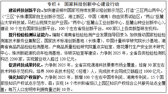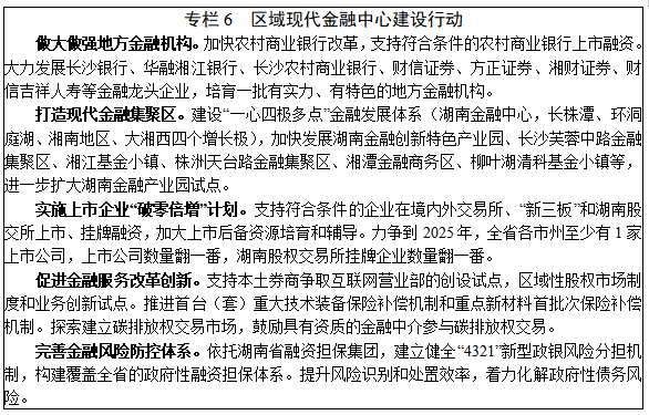 3.现代金融。增强金融服务实体经济能力,推进金融产品和服务创新,建设多层次资本市场体系,深化金融改革和扩大开放,提升金融风险防控能力,建立与“三高四新”战略相适应的现代金融服务体系,打造区域现代金融中心。力争到2025年,全省金融业增加值占GDP比重达到6%左右。强化服务实体经济能力。重点发展数字普惠金融,提高小微企业信用贷款占比和制造业中长期贷款比重。强化科技金融发展,加大科技信贷投入,鼓励开展知识产权质押融资、科技融资担保等业务。发展绿色金融,创建国家绿色金融改革创新试验区,引导金融机构加大对低碳产业、清洁能源、节能环保等领域信贷投放力度。推进“一县两行”建设,促进金融业支持乡村振兴。探索创新供应链金融服务模式。完善保险市场,创新发展科技保险,推广发展专利保险、安全生产责任险等,健全农业保险体系,稳步拓展基础保险服务“村村通”试点范围。建设多层次资本市场体系。实施上市企业“破零倍增”计划。争取湖南股权交易所纳入全国区域股权市场试点范围,发挥好现有有色金属、林权、能源交易等平台作用,设立军民融合、文化创意等特色板块。大力发展私募股权基金,加快湘江基金小镇等基金集聚区建设。发展新型金融服务。支持消费金融、产业基金等新兴金融服务发展,申请设立期货交割库,引导“7+4”类地方金融组织、互联网金融平台和第三方支付行业规范发展。稳步推进金融改革开放。促进金融业数字化转型,积极稳妥推进长沙数字人民币试点工作,适时将数字人民币试点工作向全省推广。创新中国(湖南)自由贸易试验区金融服务,引进国际优质金融资源,拓展地方金融机构境外融资业务和企业境外融资渠道。防范化解地方金融风险。加强地方金融信用体系建设,建立健全全省地方金融风险监测预警平台和中小企业信用信息服务平台,推动地方金融信用信息共享应用和金融风险防控全覆盖。