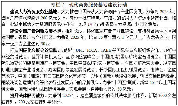 4.商务服务。加快推进商务服务业品牌化、专业化、国际化发展,建设功能完备、业态丰富的现代商务服务基地。力争到2025年,全省商务服务业增加值突破2000亿元。提升人力资源服务供给水平。发展高级人才寻访、人力资源管理咨询、人力资源软件开发、灵活用工等服务,大力推进国家人力资源服务产业园建设,争创一批“全国人力资源服务机构诚信示范单位”。培育会展服务品牌。大力发展数字会展,引进国际知名会展品牌,提高现有场馆配套设施的智能化和信息化水平,利用湖南企业国际化管理服务平台,优化湖南展会数据库,规范展会信息发布。完善公共法律服务体系。提高法律服务质量,发展涉外法律服务机构,加强法律服务队伍建设,培养一批行业领军人才和涉外法律人才,完善职业行为规范和诚信评价体系。大力推动基本公共法律服务均衡发展,建设融合公共法律服务实体、网络、热线的平台。促进广告产业转型升级。推动广告业数字化转型,运用AR、VR等技术,拓展直播、短视频等数字媒体推广渠道,培育一批国家一级广告企业,建设一批国家、省级广告产业园。完善广告综合监督体系,加大查处虚假违法广告。大力发展专业咨询服务。推动会计、审计、资产评估、信用评估等行业发展,丰富品牌策划、营销策划、财务顾问、后勤管理等企业管理服务。