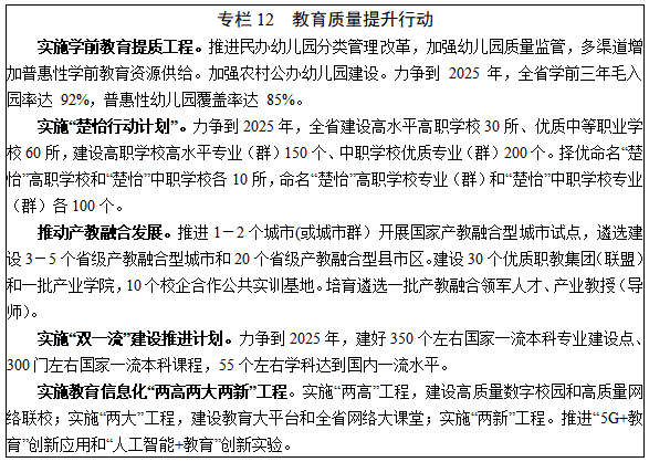 9.教育培训。统筹公办教育和民办教育发展,建立覆盖全员、全过程、全方位的育人体系。普及学前教育。实施学前教育提质工程,大力发展普惠性学前教育,构建覆盖城乡、布局合理、公益普惠的学前教育公共服务体系。健全职业教育。推进部省共建职业教育改革发展高地工程,大力实施“楚怡行动计划”,促进产教融合发展。推动中职教育特色发展,提升高等职业教育发展水平,积极稳妥开展本科层次职业教育试点。完善终身教育。推动终身教育创新规范发展,建立全民终身学习推进机制,发挥在线教育优势,完善终身学习体系,建设学习型社会。推进湖南开放大学建设。扩大老年教育资源供给,搭建老年教育资源共享和公共服务平台。提质高等教育。实施“双一流”建设推进计划,着力培养世界一流和国内一流学校与学科。高质量发展研究生教育,大力优化培养类型结构。支持高校引进国(境)外优质资源,开展高水平高质量合作办学,做强“留学湖南”品牌。发展智慧教育。以“国家教育信息化 2.0 试点省”为抓手,加快推进新型基础网络、数字校园、学习终端等建设,打造一批教育信息化融合应用实验区和教育信息化创新试点学校,探索5G和人工智能等条件下的教育新形态。