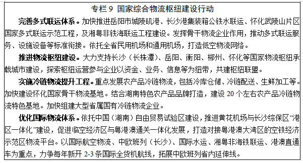 6.现代物流。依托“三纵五横”骨干交通网络,着力构建“通道+枢纽+网络+平台”的物流体系,打造国家综合物流枢纽。力争到2025年,社会物流总费用占GDP比率下降2个百分点左右。推进多式联运发展。加快港口、铁路、公路、机场等多式联运物流基础设施建设,打通公铁水空联运衔接“最后一公里”,实现企业间业务单证“一单制”。增强国际物流服务功能,构建“四小时航空经济圈”,优化中欧班列网点布局,推进东盟班列常态化运营,加密“五定班轮”班次,推动区域性保税物流中心和国际快件中心建设。完善冷链物流系统。优化冷链设施建设布局,依托农副产品批发市场、冷链产品生产加工龙头企业和大型连锁超市等,大力推进国家骨干物流基地建设,打造生产、加工、储存、运输等过程一体化冷链物流配送网络体系。促进物流智能终端设施建设和资源共享,推广农产品“生鲜电子商务+冷链宅配”“中央厨房+食材冷链配送”等新模式。健全城乡物流配送网络。实施城乡物流高效配送专项行动和“快递进村”工程,完善县乡村三级物流配送网络,推动农村客运与物流融合发展,补齐村级网络短板,实现全省县级物流配送中心和村级寄递物流配送站全覆盖。发展供应链物流。实施数字化供应链工程,建设供应链数据资产交易中心,推进全省物流信息互联互通,创建全国供应链创新与应用示范城市、示范企业。大力发展网络货运。推进标准化托盘、周转箱循环共用体系建设,实施货物包装和物流器具绿色化、减量化。加快建立应急物流协同体系,建设一批应急物流重点设施基地。