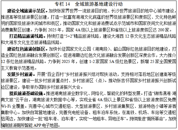 11.旅游业。深入挖掘自然生态、人文历史、民族风情等旅游资源,促进文化和旅游融合,丰富文旅服务供给,全面提升旅游服务质量和“锦绣潇湘”旅游品牌知名度,着力打造“五大板块、五大协作区、三个走廊”的“553”文旅发展格局,建设世界知名旅游目的地、全域旅游基地。力争到2025年,全省旅游总收入突破1.5万亿元。开发生态旅游资源。充分利用武陵山、雪峰山、南岭、罗霄山、南山、洞庭湖等自然生态资源,大力开发山地避暑、湖泊度假、山地运动、生态康养、森林体验、生态露营等产品,着力打造一批国家级生态旅游目的地、生态旅游景区。培育红色旅游市场。着力打造湘东、湘南、湘西三大红色旅游发展带,深入推进湘赣边红色文化旅游融合发展,加快长征沿线地区红色旅游项目和韶山—井冈山红色旅游铁路建设,保护利用伟人故里、革命人物故居,大力开发红色旅游精品线路,推出一批廉政文化教育基地、党员红色文化教育基地、红色研学旅行基地、红色旅游小镇和红色旅游乡村振兴重点村,提升湖南红色旅游文化节影响力。提高乡村旅游质量。完善乡村旅游配套设施,探索发展都市依托型、景区依托型、民俗风情型、古村古镇型、红色文化型、现代农业型、创意农业型等创新模式。发展人文特色旅游。以大湘西和大湘南地区“全国少数民族特色村寨”为重点,设计开发具有湖南特色的民族风俗旅游产品。以炎帝陵、舜帝陵为重点,打造始祖文化目的地。依托历史文化名城、名镇,传统古村落、古街区等人文古迹,在保留遗产原真性的基础上进行合理的旅游开发。鼓励非遗进景区,促进非遗的传承保护与开发利用。拓展文旅新业态。大力发展都市旅游、民宿风情、徒步探险、低空飞行、研学旅游、工业旅游等新业态。鼓励VR、AI、全息技术等在旅游体验中应用,大力发展沉浸式旅游、体验式旅游。