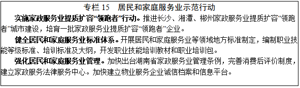 12.居民和家庭服务。进一步完善家政、托育、物业、社区等服务标准,提升从业人员素质,健全行业诚信体系,满足城镇居民家庭多元化、个性化、高品质的服务需求。提升家政服务。发展母婴服务、养老护理、家庭管理、钟点厨师等全方位、精细化服务。开展家政服务提质扩容“领跑者”行动,培育连锁家政服务品牌。大力发展“互联网+家政”, 推动居民和家庭服务等消费领域信用体系建设。完善托育服务。强化集中托育、育儿指导、养护培训等服务,建立家庭托育点登记备案制度,研究出台家庭托育点管理办法,支持普惠性婴幼儿照护服务机构发展,建立集中管理运营的社区托育服务网络。鼓励发展互联网直播互动式家庭育儿服务,开发婴幼儿养育课程、父母课堂等,培育智慧托育新业态。规范物业服务。鼓励物业企业向智慧社区运营商转型,延伸安全、购物、教育、养老等服务功能。推进智慧物业管理服务平台建设,构建物业管理、政务服务、公共服务和生活服务一体化平台,促进物业服务线上线下融合发展。完善物业服务市场监管体系,建立健全物业管理信息公开公示制度和企业信用管理制度,优化物业服务市场竞争环境。发展社区服务。加快推进社区综合服务中心建设,建立提供餐饮零售、家政服务、美容美发、洗涤保养、售后维修、养老服务等生活性服务的“一站式”社区服务体系。提高社区服务智能化水平,完善自助服务设施布局。