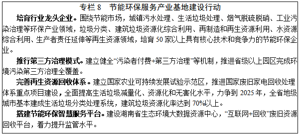 5.节能环保服务。推进生态强省建设,促进生产生活方式绿色转型,建设全国重要的节能环保服务产业基地。力争 “十四五”期间,全省节能环保服务业产值年均增长15%以上。发展节能服务。推动发展合同能源管理,积极推广节能咨询、诊断、设计、融资、改造、托管等“一站式”综合服务模式,实施“能效领跑者”制度,持续推进低碳、节能产品认证,推广低碳、节能技术应用,开展国家级节约型公共机构示范单位创建。壮大环保服务。发展生态修复、环境风险与损害评价、排污权交易、绿色认证等环保服务,探索环境管家、绿色联盟、产业共生、第三方环境服务等新模式,鼓励发展环保服务总承包和环境治理特许经营,推进小城镇环境综合治理托管服务国家试点。培育“碳达峰”“碳中和”衍生服务。拓展碳资产管理、碳咨询、碳排放权交易,完善碳市场管理层级和能源消费双控制度,积极参与国家碳排放交易市场建设和气候投融资试点,开展空气质量达标与碳排放达峰“双达”试点示范创建。完善再生资源回收体系。推进废旧家电回收处理体系建设,建立健全废旧农用物资回收利用网络,建设线上线下融合的废旧资源回收和循环利用平台。鼓励具备条件的县市区实施生活垃圾强制分类。