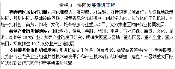 加强服务业跨区域协作。以中部崛起战略为契机,加强对接长江经济带、粤港澳大湾区、西部陆海新通道等国家区域战略,强化与周边省、城市群、城市间不同层级跨区域协同合作。加快推进湘赣边区域开放合作示范区建设,深化湘鄂赣协同发展,大力推进中部地区省际间基础设施互通、产业协同发展、生态环境共保联治等,促进中部地区加快崛起。大力推进长株潭都市圈建设,密切与武汉都市圈、昌九都市圈、成渝地区双城经济圈的深入链接,促进商贸物流、文化旅游、科技信息等方面合作,建设长江上中下游服务业密切合作经济带。加强与粤港澳大湾区的深度合作,深入推进泛珠三角区域合作机制,积极对接广深港澳科技走廊,促进旅游休闲康养联动,建设京广线战略新兴产业承接带。加强湘西地区与西部省份的交流协作,推进湘渝黔文化旅游、医疗康养、商贸流通等领域合作,建设湘渝黔边城协作发展合作区。深化与北部湾地区在东盟国家物流产业园、多式联运、国际中转运输等合作,促进湘桂琼商贸合作。